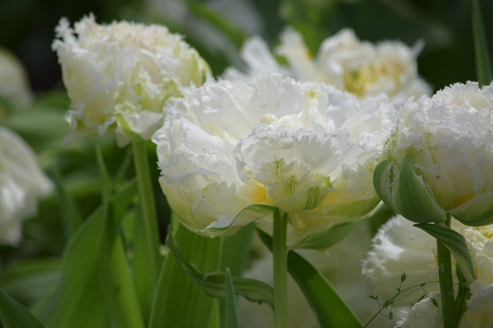 أزهار مزدوجة ضخمة من البتلات البيضاء ذات الحواف المهدبة في أواخر الربيع.