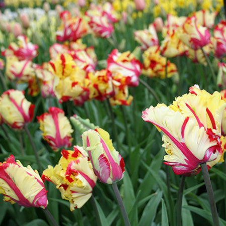 زهرة توليب الببغاء اسمها مستمدة من بتلاتها الزاهية الألوان، ذات المظهر المتجعّد، التي تُشكّل أزهارًا ضخمةً بشكلٍ مذهل. أزهارها منتفخة، ملتوية، ومتوسّعة، مما يُضفي لمسةً من البهجة على حديقة الربيع.