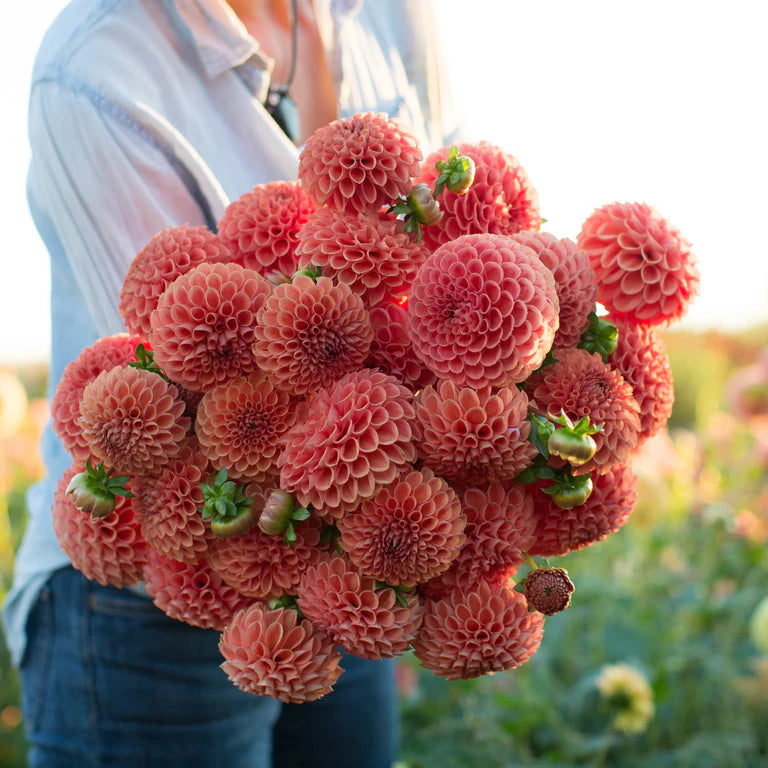 Dahlias are lush flowering plants. Perennials in hot and moderate countries, dahlias need to be grown as annuals in cold winter regions. Being frost sensitive, dahlia tubers need to be planted outside in late spring after all danger of frost has gone by to reward you with an enormous number of large flowers late summer until first frost in autumn and lifted in the fall before temperates dip below zero, leaves and soil cleaned off and stored inside in a cool, dry place. Prune new growth to obtain more bushy dahlia plants and deadhead often once flowering starts to obtain an increased number of blooms. Dahlia can be grown and propagated from seeds, tuberous roots and rooted cuttings. Dahlias are fast growers and one plant produces numerous flowers making them ideal to grow for cut flowers. Substantial composite flower heads are produced on leafy stems. The florets come in a vast array of colours encouraged by the ease of creating dahlia hybrids. Plant in full sun with afternoon shade and water often. 3’’ wide flowers. Height: 100cm/ 40’’