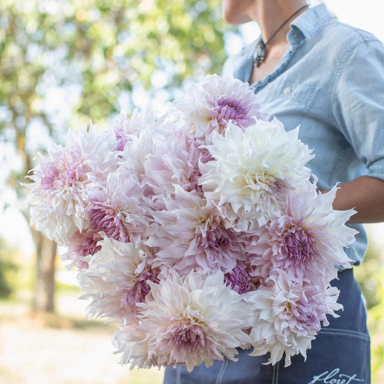 Dahlias are lush flowering plants. Perennials in hot and moderate countries, dahlias need to be grown as annuals in cold winter regions. Being frost sensitive, dahlia tubers need to be planted outside in late spring after all danger of frost has gone by to reward you with an enormous number of large flowers late summer until first frost in autumn and lifted in the fall before temperates dip below zero, leaves and soil cleaned off and stored inside in a cool, dry place. Prune new growth to obtain more bushy dahlia plants and deadhead often once flowering starts to obtain an increased number of blooms. Dahlia can be grown and propagated from seeds, tuberous roots and rooted cuttings. Dahlias are fast growers and one plant produces numerous flowers making them ideal to grow for cut flowers. Substantial composite flower heads are produced on leafy stems. The florets come in a vast array of colours encouraged by the ease of creating dahlia hybrids. Plant in full sun with afternoon shade and water often. 9’’ wide flowers. Height: 100cm/ 40’’