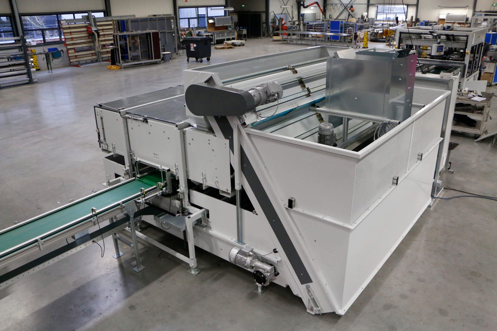 The template filler gives a clean result by first collecting the trays on a conveyor belt, which is then pushed upwards to the template to avoid any spillage. An integrated brush mounted at the filling head cleans the top of the pot. By changing the number of filling cycles, soil compactness can easily be changed. The maximum tray dimensions are 2.720 x 630 x 200 mm. The hopper volume contains 750 litres and is expandable to 1000 litre.