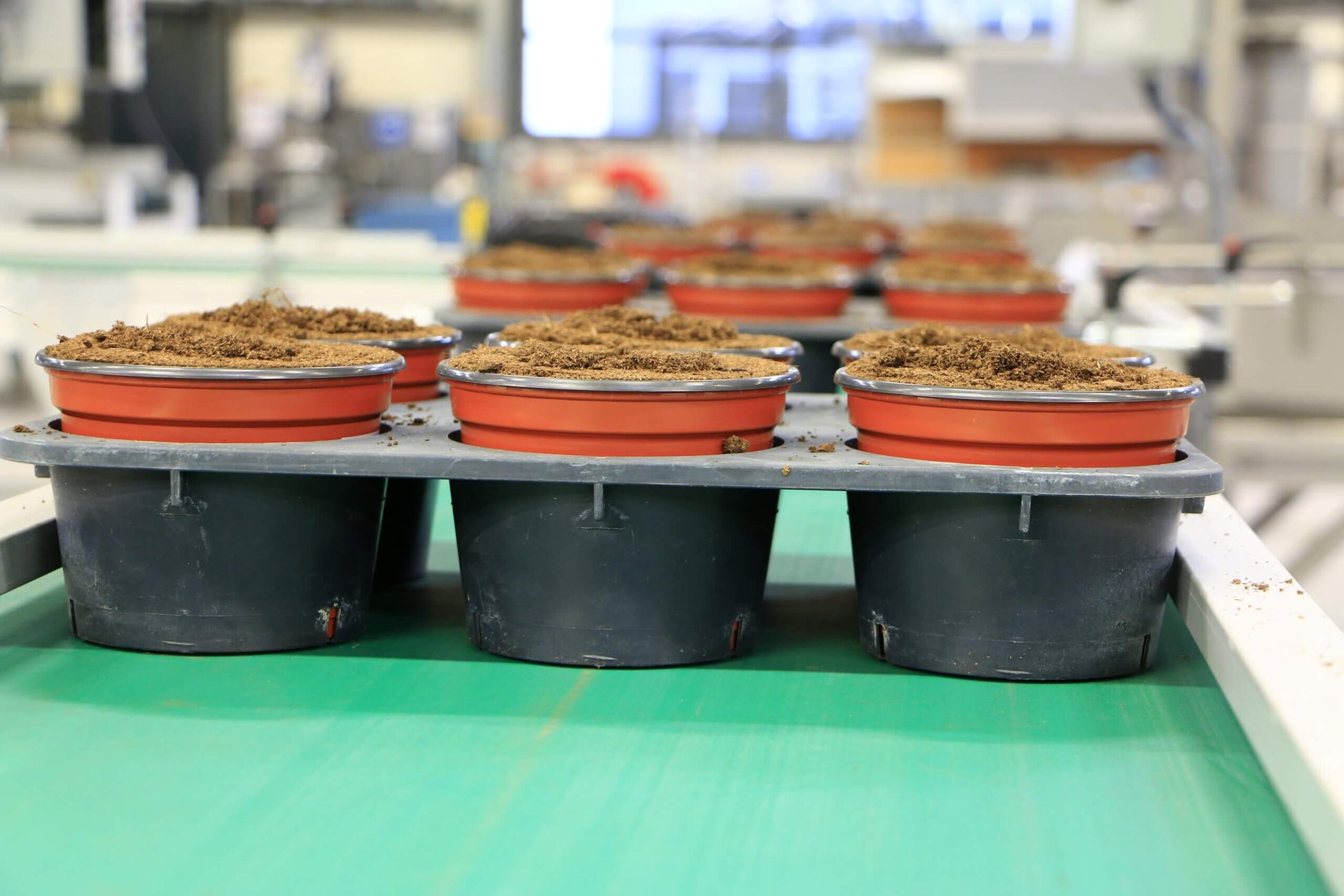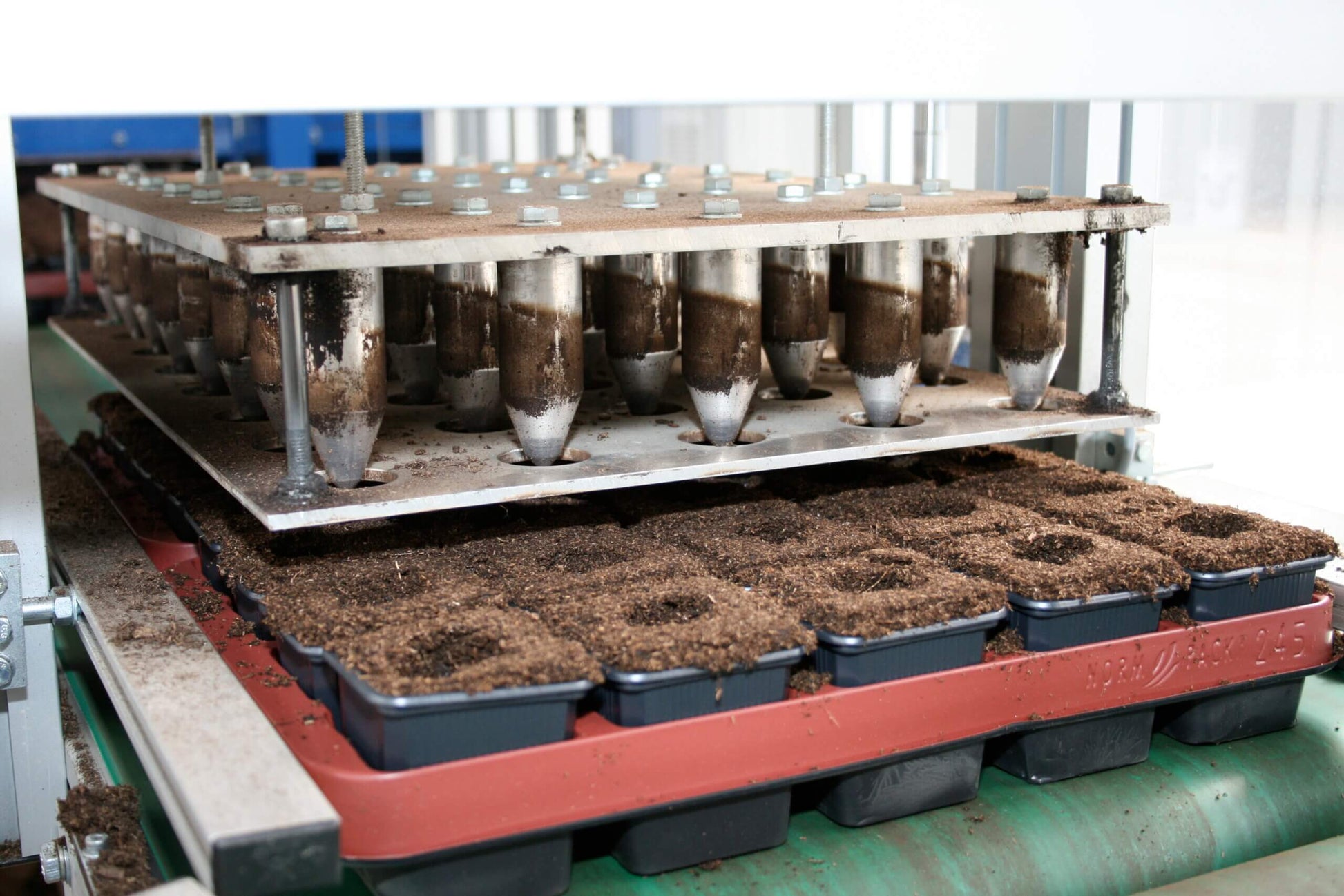 The FF Filler is a unique high capacity batch filler, filling up to 1,000 templates per hour. It is suited for pots in a carrier tray where the top of the pots are not equal to the top of the carrier tray and for pots in trays with space between them. Using a template that matches the tray format, the soil ends up in the pot or the cell of the tray. Therefore, the filling result is nice and clean. No soil is spilled in the process. Using templates makes it easy to change to a different tray format by simply changing the template.