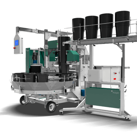 The Mayer TM potting robot comes customized for different applications, from ornamental plants, to horticultural plants and tree nurseries. Pot size range used and speed required for the operation are key determining factors.