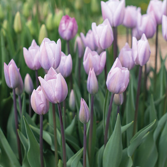 Tulips are perennial herbaceous bulbiferous geophytes with showy flowers in various shades and tints of attractive hues. One of the first flowers to bloom in the spring, plant tulips in mass to create a striking visual effect. Add interest to your lawn by planting tulip bulbs in the turf; once the flowers and leaves die back tulips become dormant in the summer to emerge from their bulb again the next year. In their natural growing environment tulips grow wild in steppes and mountainous areas with temperate climates. Endemic to the Near East and Central Asia, tulips may have been in cultivation as early as the 10th century in Persia. With the long history of cultivation and naturalization of tulips in different parts of the world classification of hybrids and cultivars is complex. Tulip plants require very low maintenance. Plant early, mid and late flowering varieties for a continuous spring display in a wide spectrum of colours. Tulips continue to grow after being cut, making these flowers a favourite for florists and last long in a vase as cut flowers.