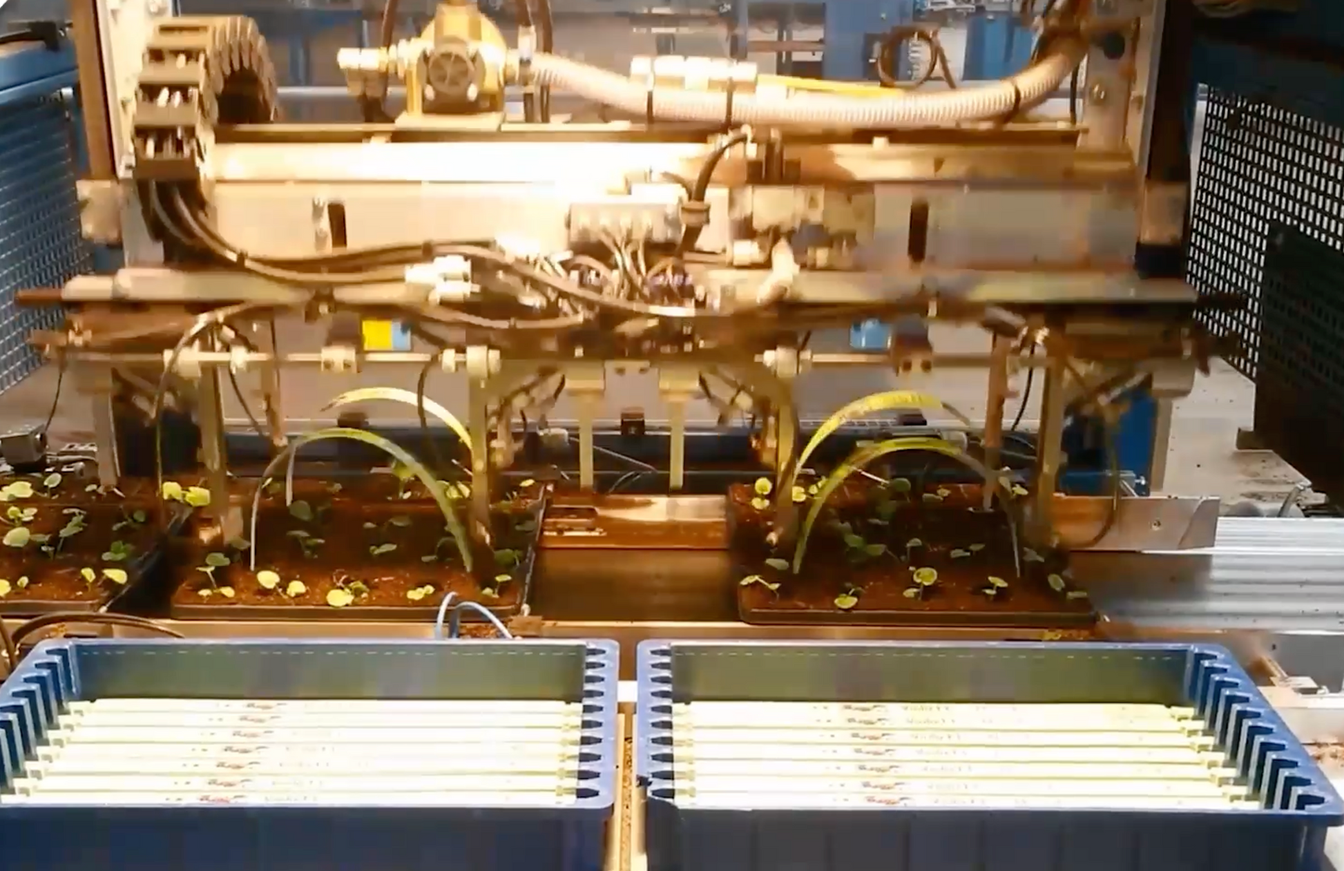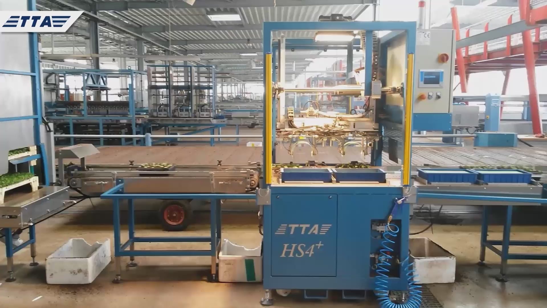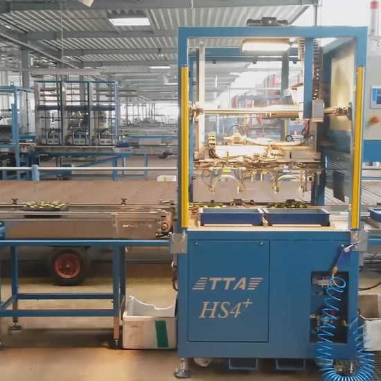The HS4 is an automatic application machine for handles on bedding plant packs. It has a sliding table where storage boxes with handles can be staged. When the boxes with handles are empty, the table automatically slides to the other side with filled boxes to continue and ensure minimal downtime.