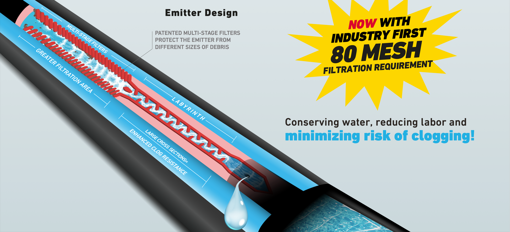 Enhanced clog resistance with industry first filtration requirements as low as 80 mesh, the lowest for any drip tape.