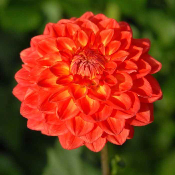 4" blooms of bright orange and yellow. Plenty of stem length on this very strong plant, 5' tall. Great vibrant color for fall arrangements. Formal Decorative Dahlia. Flowers in an average of 90 days. In cultivation since 2016.