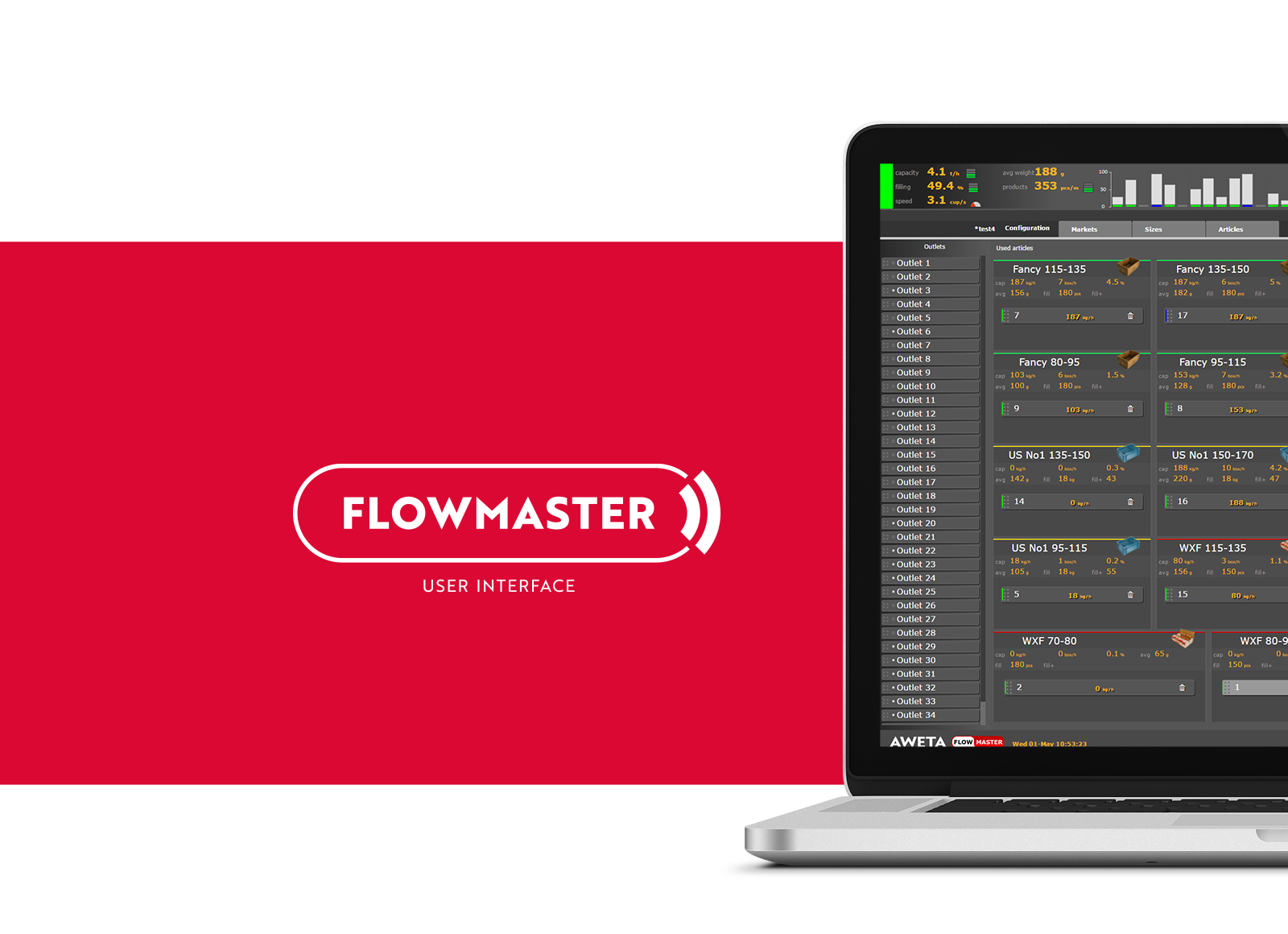 Flow Master is a user friendly interface that allows you to control your sorting and packing needs in a very simple and efficient way. It is a full operating system and can be used for all involved parties, from sorting to packing and palletizing your large drupes.
