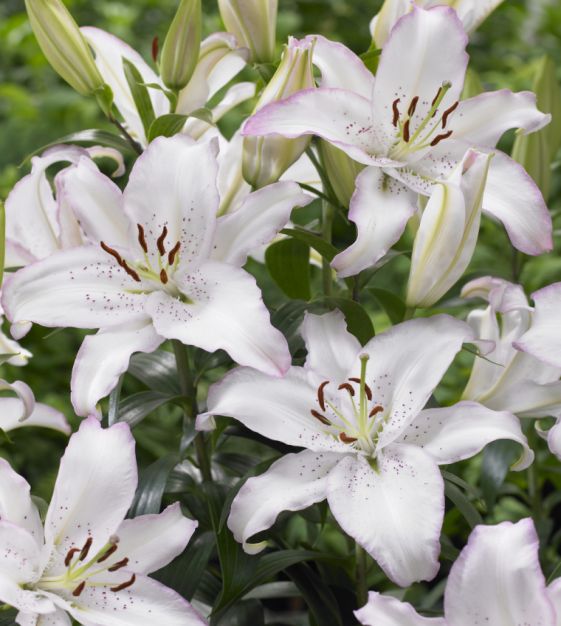 Oriental lilies are crossbreeds of the Lilium section Archelirion and other species native to Japan. Cultivars within the Oriental lily classification produce large, strongly scented, outward facing flowers on tall plants. Magnificent late summer garden focal point. Excellent cut flower crop. Plant in full sun to part shade. Hardy down to USDA zone 3. Height x Spread: 80cm/ 32’’ x 40cm/ 16’’