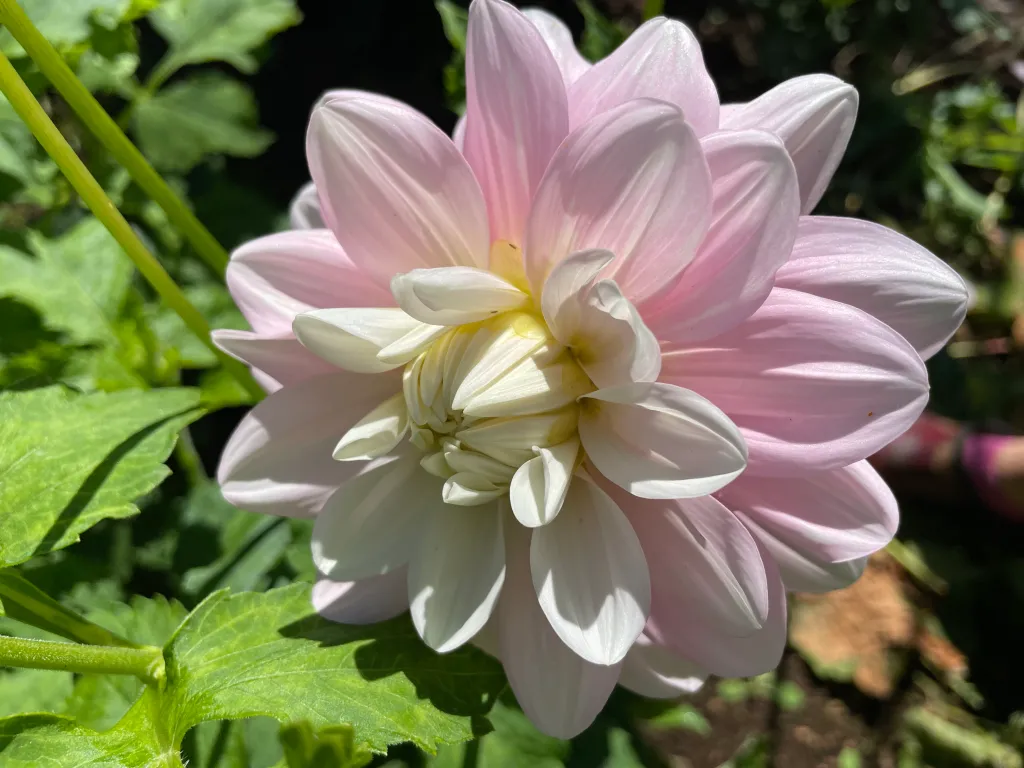 4" Soft pastel pink, blending to a cream white centre, slightly edged in lavender. Beautiful addition to your garden, and the 4 1/2' plant produces lots of laterals to cut. Informal Decorative Dahlia.