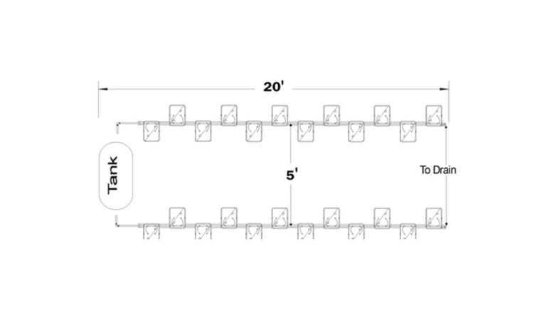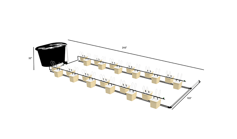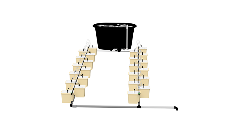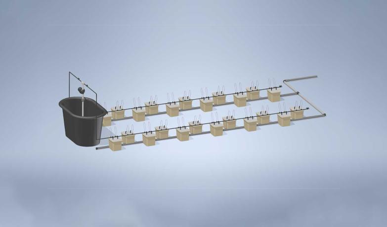- Set up the Bato Dutch buckets on a flat surface with the feed drip irrigation line supplying the roots with nutrition from above and the gravity draining pipe at the bottom.