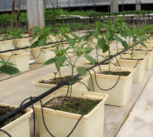 - The Dutch buckets are top fed by a drip nutritive solution emitter.