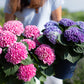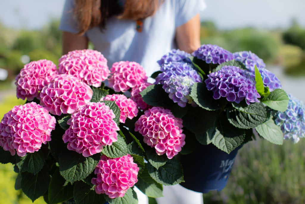 Hydrangea macrophylla, endemic to East Asia, grow into large deciduous shrubs of rich foliage with big leaves and corymb inflorescences with florets ranging from blue to purple to red fuchsia to pale pink depending on soil acidity from pH below 7 acidic soil to above pH 7 alkaline soil respectively. Bigleaf hydrangea grows in seaside and mountain habitats and is partial to the shade of woodland gardens and plenty of water. French hydrangea forms flower buds for the next season in late summer so minimal pruning is recommended for most prolific flowering. Early summer to autumn blooming long lasting flowers make for excellent cut flowers.