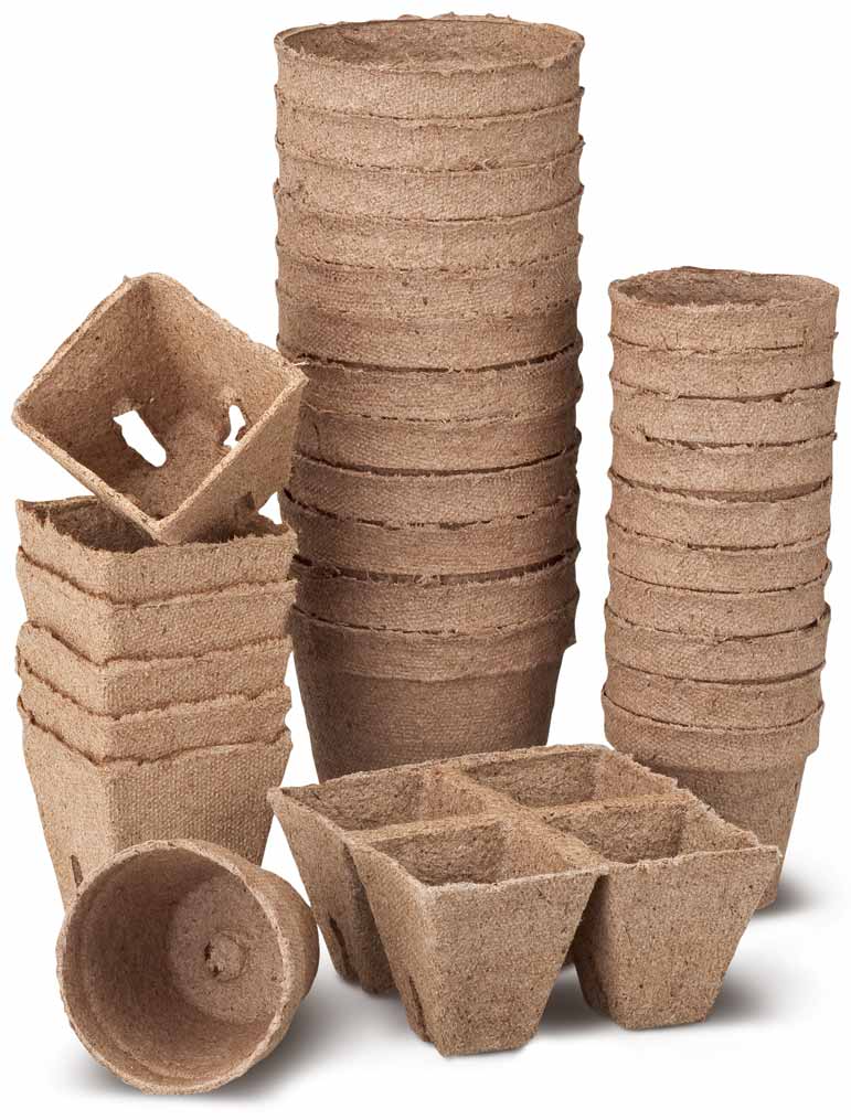 Organic biodegradable seeding pots and trays made of peat and coconut coir that you can plant along with your plants when potting up or planting into the ground, effectively eliminating transplant shock.