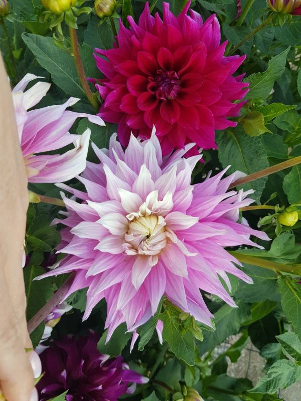 Dahlias are lush flowering plants. Perennials in hot and moderate countries, dahlias need to be grown as annuals in cold winter regions. Being frost sensitive, dahlia tubers need to be planted outside in late spring after all danger of frost has gone by to reward you with an enormous number of large flowers late summer until first frost in autumn and lifted in the fall before temperates dip below zero, leaves and soil cleaned off and stored inside in a cool, dry place. Prune new growth to obtain more bushy dahlia plants and deadhead often once flowering starts to obtain an increased number of blooms. Dahlia can be grown and propagated from seeds, tuberous roots and rooted cuttings. Dahlias are fast growers and one plant produces numerous flowers making them ideal to grow for cut flowers. Substantial composite flower heads are produced on leafy stems. The florets come in a vast array of colours encouraged by the ease of creating dahlia hybrids.