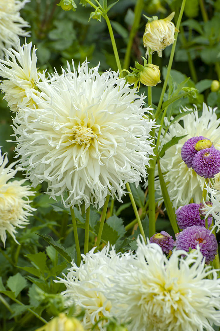 Dahlias are lush flowering plants. Perennials in hot and moderate countries, dahlias need to be grown as annuals in cold winter regions. Being frost sensitive, dahlia tubers need to be planted outside in late spring after all danger of frost has gone by to reward you with an enormous number of large flowers late summer until first frost in autumn and lifted in the fall before temperates dip below zero, leaves and soil cleaned off and stored inside in a cool, dry place. Prune new growth to obtain more bushy dahlia plants and deadhead often once flowering starts to obtain an increased number of blooms. Dahlia can be grown and propagated from seeds, tuberous roots and rooted cuttings. Dahlias are fast growers and one plant produces numerous flowers making them ideal to grow for cut flowers. Substantial composite flower heads are produced on leafy stems. The florets come in a vast array of colours encouraged by the ease of creating dahlia hybrids. Plant in full sun with afternoon shade and water often. 6’’ wide flowers. Height: 90cm/ 36’’