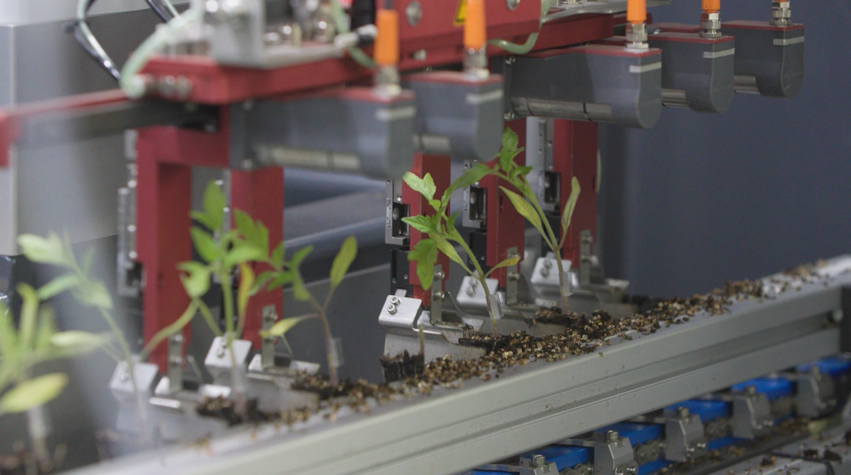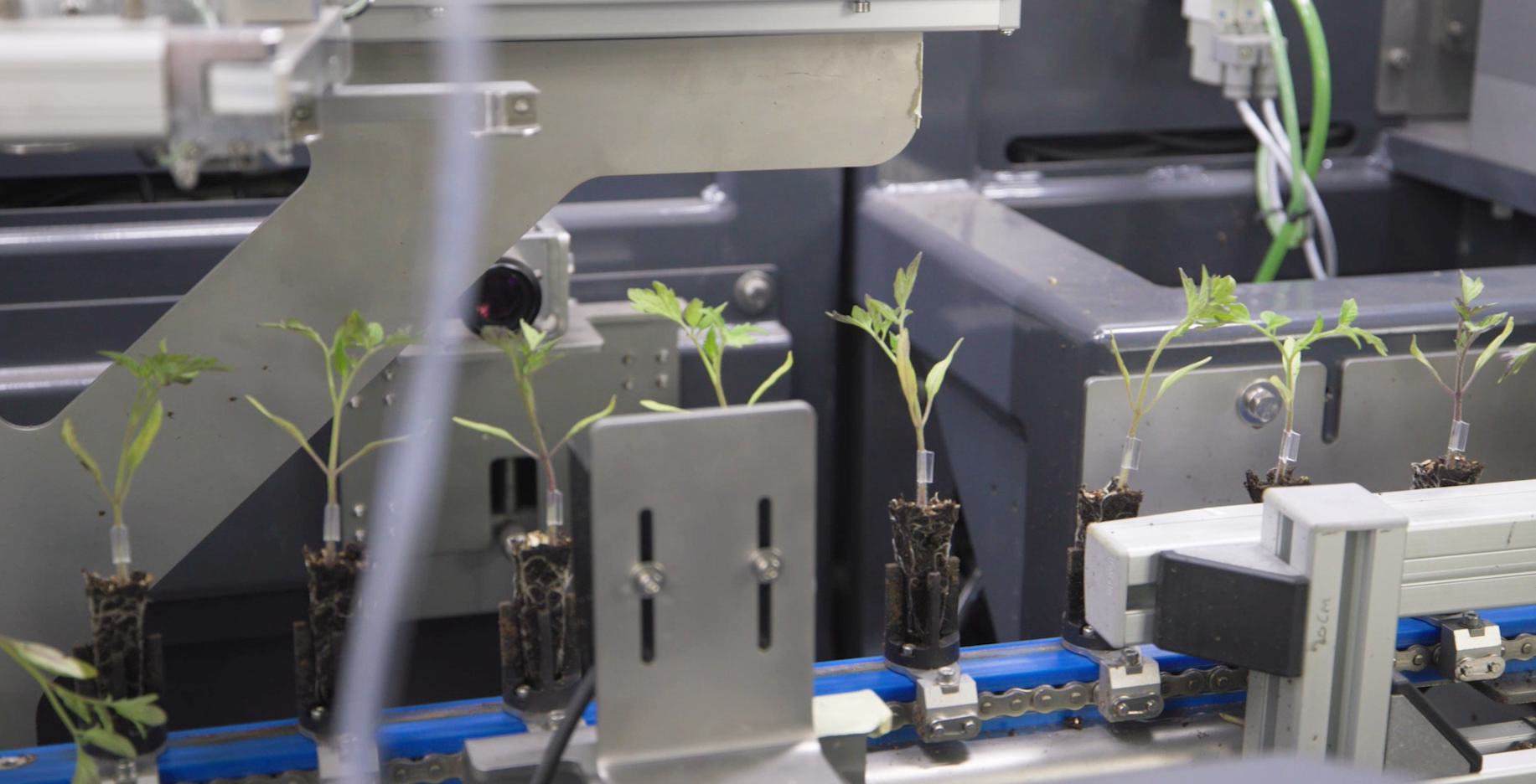 The rootstocks and scions are automatically fed into the machine. Vision AI technology ensures a careful selection process; cameras inspect the plants for size, height, and broken stems. Only selected plants proceed and are simultaneously cut and joined with a lightweight clip. The grafted plants are then scanned again for grafting quality. Where people used to handle all these tasks, AI and robots now take over, resulting in much higher quality finishing and stronger plants.