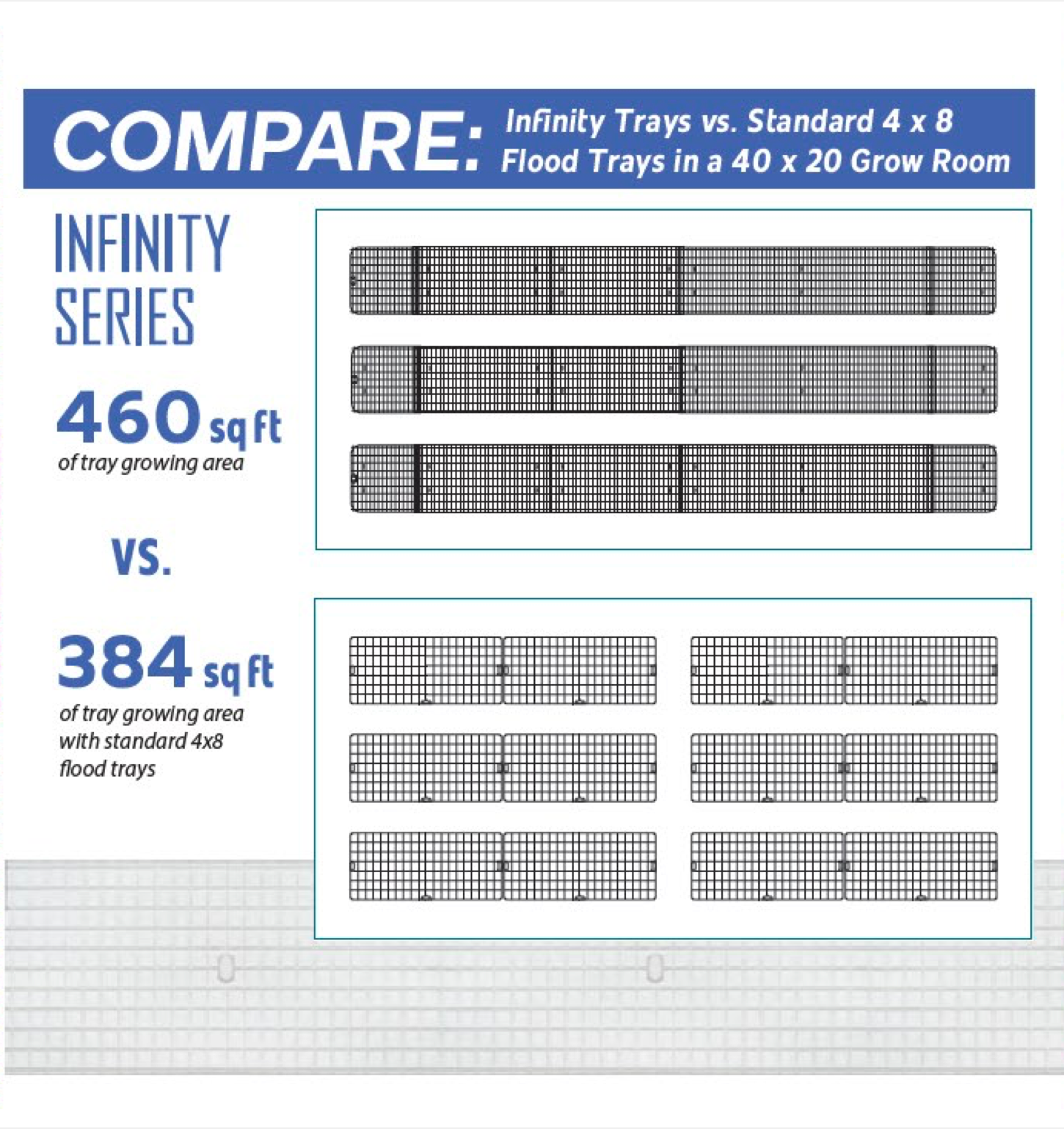 - Flood and drain setups are not recommended to exceed 64' to ensure nutrients are equally distributed in the crop. If your grow space requires additional benches, begin a new station with an Infinity endcap to set up another continuous station.