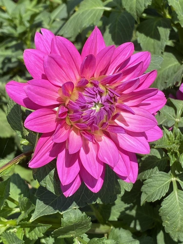 The 4 1/2" blossoms are a hot fuchsia with lavender undertones and a slight yellow in the center. Extremely dense lush foliage on a 4' plant. Great for lots of flowers in late summer as well as a good garden variety. Informal Decorative Dahlia. Flowers in an average of 120 days. In cultivation since 1995.