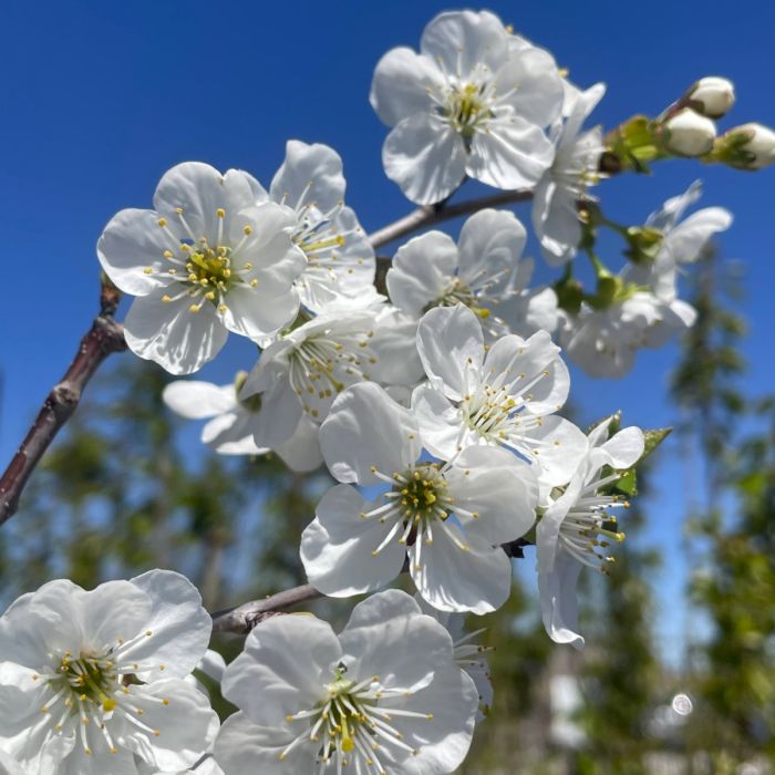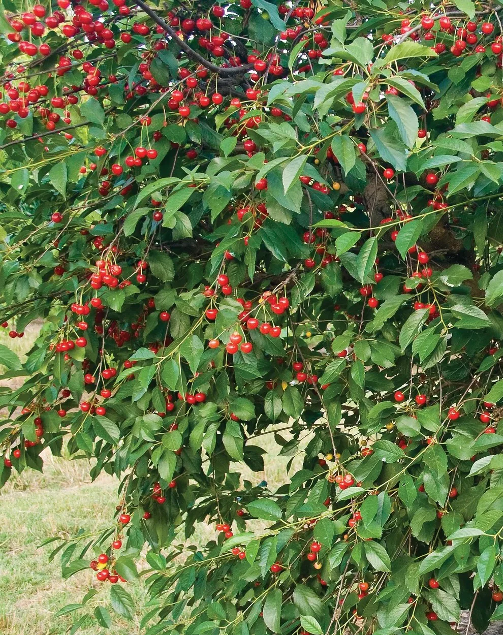 Montmorency is an old favourite variety of cherry that originated in France in the 17th century and is still the most popular pie and dessert cherry variety in North America. A cross between a sweet cherry and Prunus tomentosa, the Nanjing cherry, this cold hardy and disease resistant sour cherry tree with spreading form bears medium to large bright red cherries with firm yellow flesh that has a rich, tart, tangy flavour.