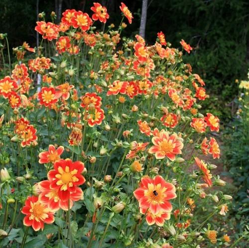 3 1/2" bright orange blooms outlined in bright yellow, with a yellow collar make this one hard to miss. Very prolific bloomer on a 4 1/2' plant. Incredible garden color and holds well as a cutflower too. An attention getting collarette variety to add to your collection. Collarette Dahlia. Flowers in an average of 90 days. In cultivation since 1998.