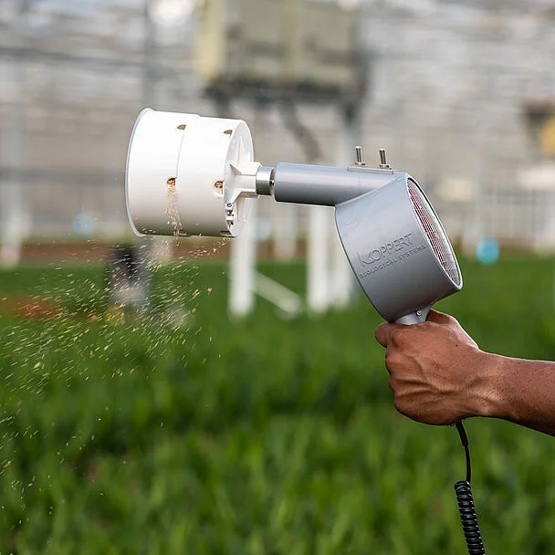 The innovative combination of the special fan of the Mini Airbug and the revolving dosing pot ensures a uniform release of carrier material containing natural enemies. The airflow from the fan guarantees a uniform distribution of this material up to a distance of at least 2 metres from the Mini Airbug.