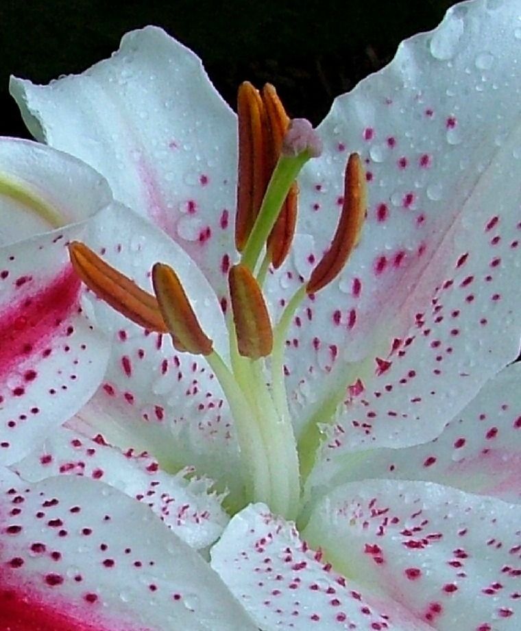 Muscadet, a beaming snow white flushed pale pink oriental lily with darker pink midveins and raspberry spotting and a narrow green starburst center. Growing from 3' to 4' high, these fragrant blooming plants may need to be staked. Abundant producers planted en masse for a lush garden display or summer flower arrangements, Orientals have large reflexing flower petals and a wonderfully sweet fragrance. Plant Oriental lilies near terraces and bedroom windows, alongside well visited summer porches and in cutting gardens so you may savour their heady fragrance fully.